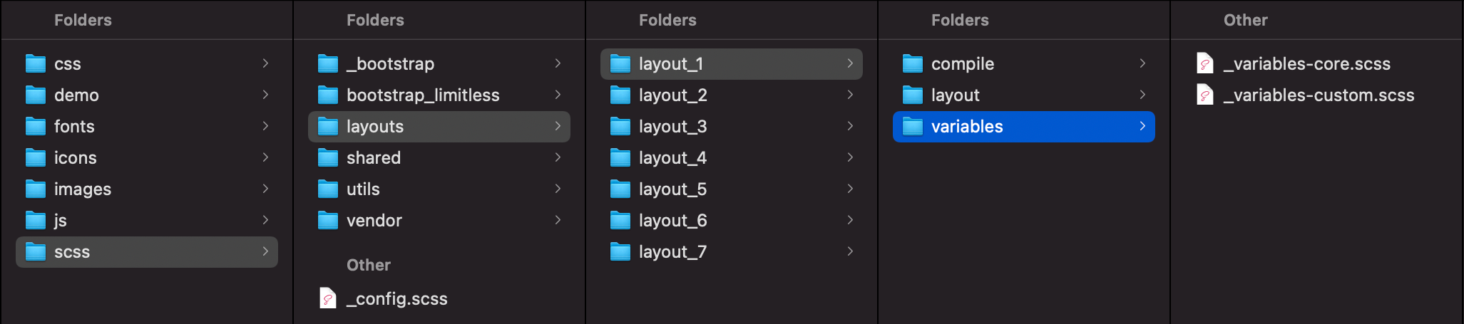 All Limitless styles are based on SCSS pre-processor - it extends the CSS language, adding features that allow variables, mixins, functions and many other techniques that allow you to make CSS that is more maintainable, themable and extendable. In total there are 180 fully commented SCSS files, including: Bootstrap components core, Bootstrap core overrides, layout and component related files. All files are properly divided into categories and stored inside nested folders: